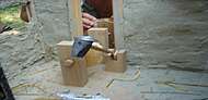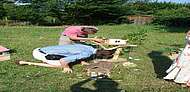 Wie war es schön, die Kinder zu be-obachten, wie sie ihrem Einsatz entgegen fieberten, wie die Augen leuchteten, wenn sie mit der großen Säge langsam ihren Sägepfad immer tiefer ins Holz versenkten, wie sie geschickt balancierend immer wieder ihren Platz auf dem noch unfertigen Grundgerüst fanden und oft erfreut feststellten, wie weit sie doch schon waren!